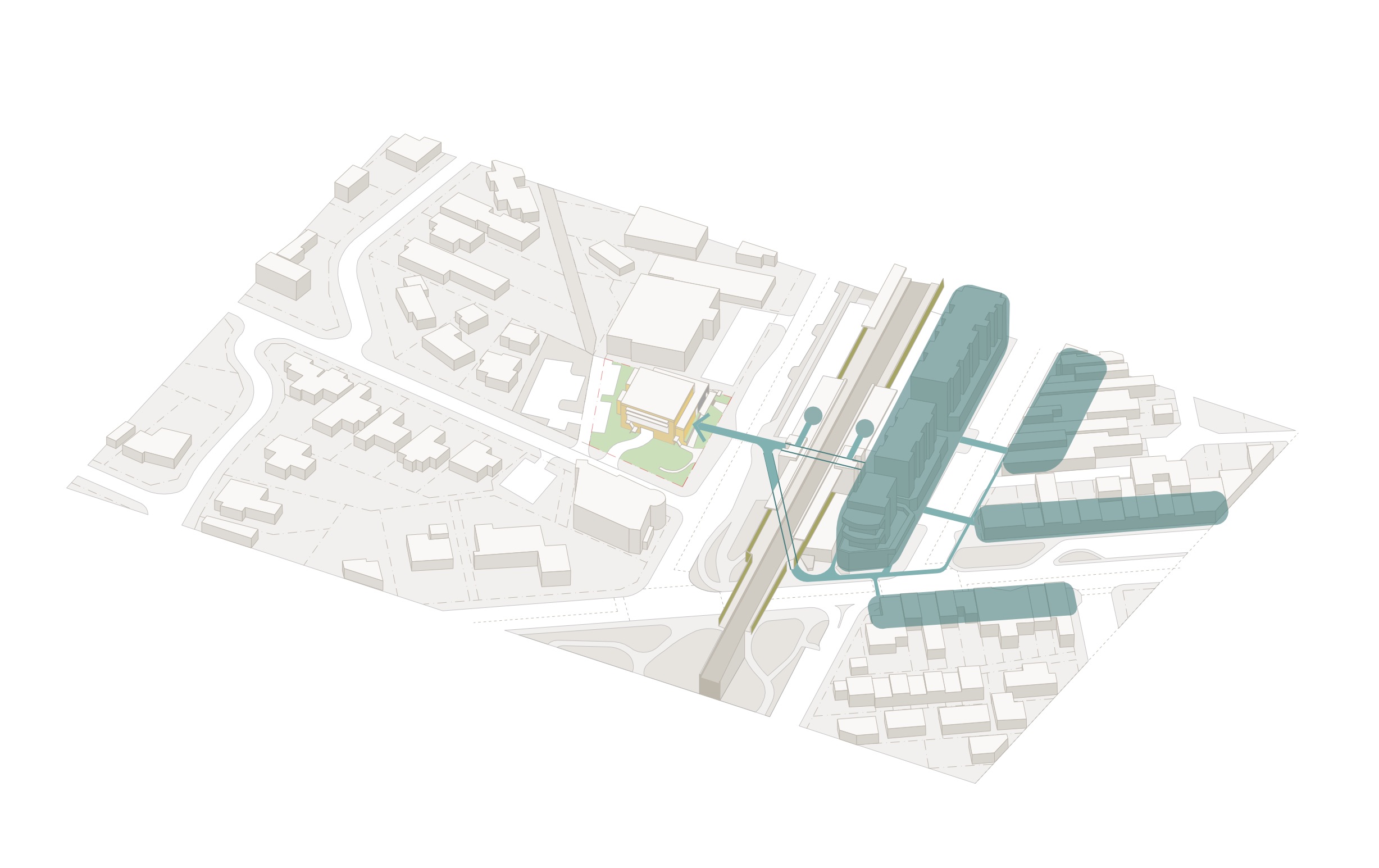 The proposed new entrance sits across the road from main entry of Rosanna Station, and is defined by a generous enveloping masonry archway. This gesture references the masonry arch entry of the existing library in the new development as acknowledgment of the cultural heritage of the arrival experience at this site.